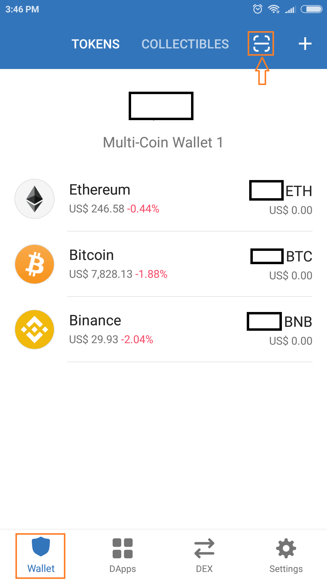 (4) Now go to Trust Wallet which is already installed in your mobile, then you can see an option on the right of Collectibles(as shown in the screenshot below),upon clicking on it will display QR code scan and under that you can see "Walletconnect". Click on wallet connect now to scan the QR code.