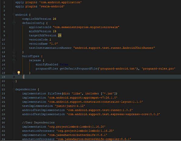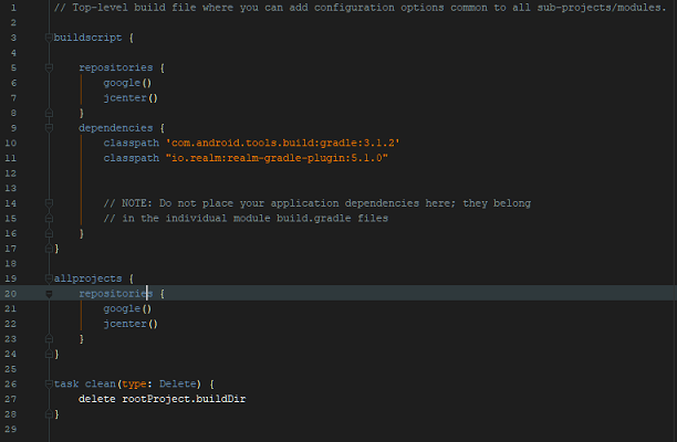 classpath "io.realm:realm-gradle-plugin:5.1.0"Next, head to your application level Gradle file "build.gradle" and add the realm-android plugin to the top of the file.