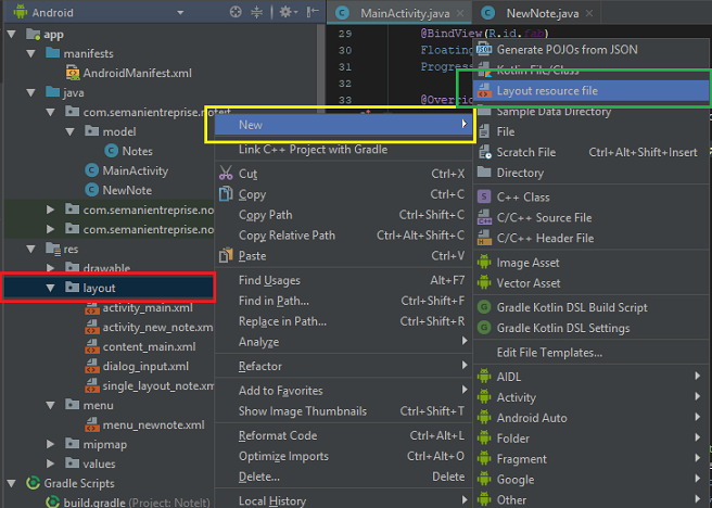 Next, we are going to be creating a layout resource file that we will be using to accept the Author's name (i.e the person taking down the note), for this, right click on layout folder (under the res folder) => New => Layout Resource File and then name it - dialog_input.xml.