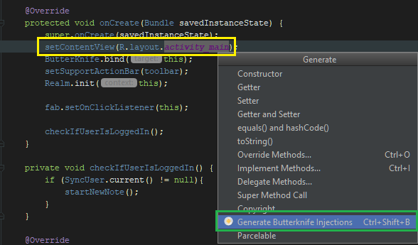 To achieve that, we are going inject the FAB in our MainActivity.java class file using ButterKnife - Place your cursor on the setContentView() method => alt + ins => Generate ButterKnife Injection and then select the FloatingActionButton as shown in the images below:
