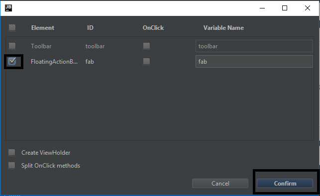 The injected code will be - @BindView(R.id.fab) FloatingActionButton fab;.