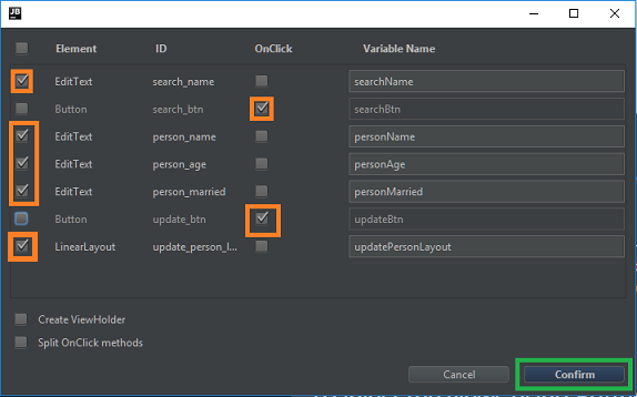 - Three EditText's used to display the matching Object's name, age, and Married values with the id's - person_name, person_age, and person_married respectively.