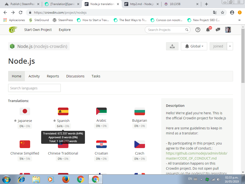 Also, Node.js is currently being translated into other 32 languages. I´m contributing to making this project accessible to the Spanish speaking community online.