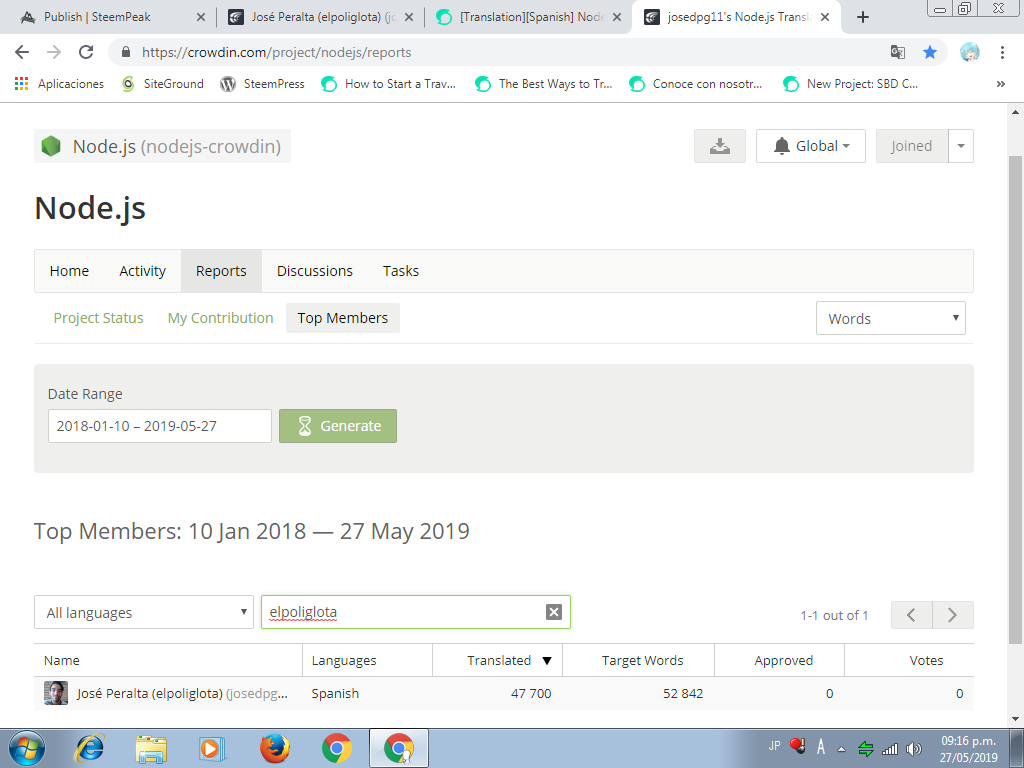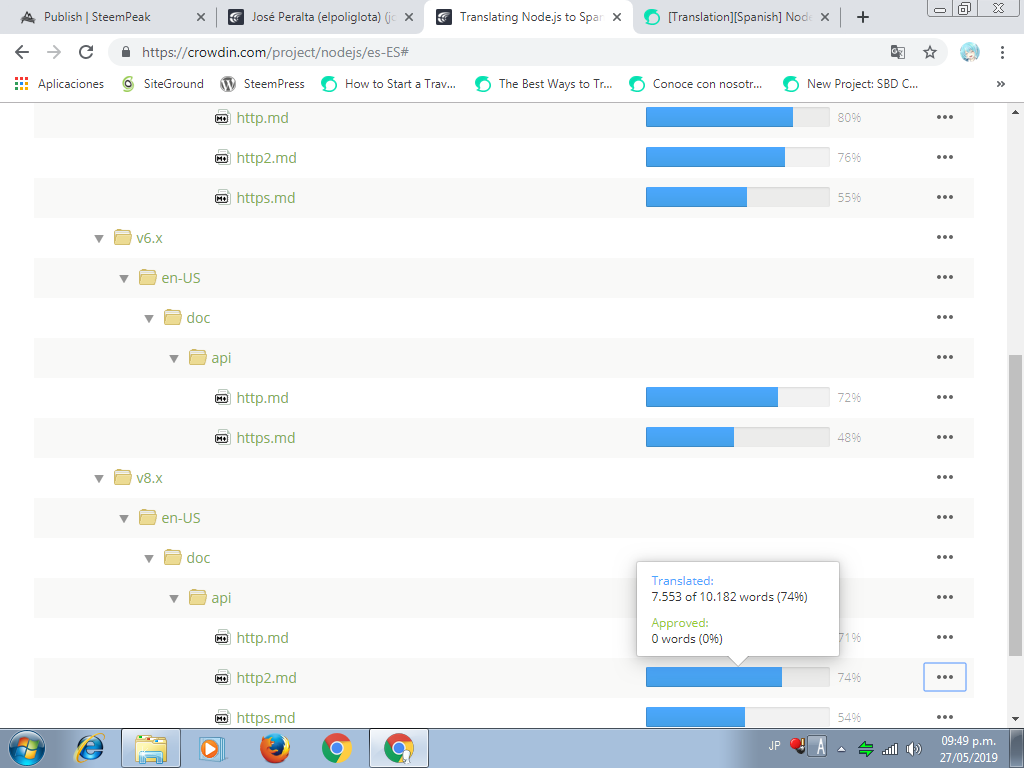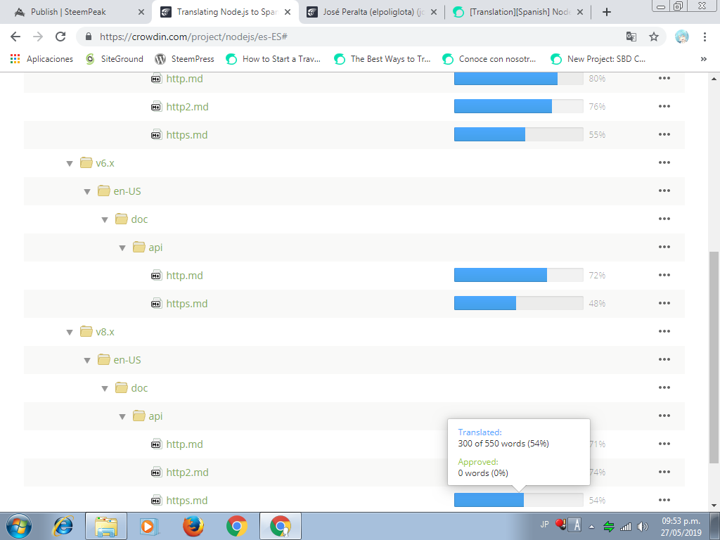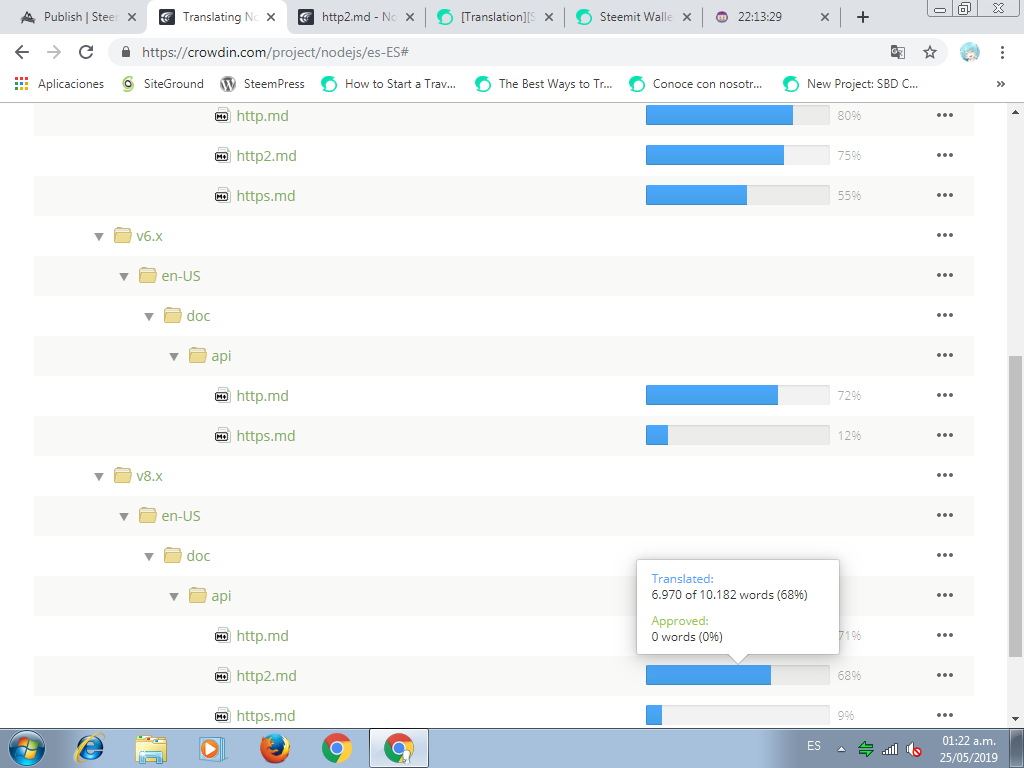705,413 words have been translated so far in the Spanish translation folder of Node.js, which amounts to a total of 67% done in regards to the completion of the translation of this big project.