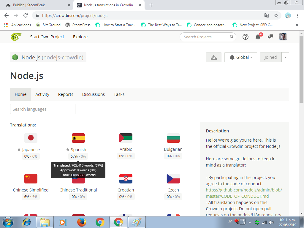 Also, Node.js is currently being translated into other 32 languages. I´m contributing to making this project accessible to the Spanish speaking community online.