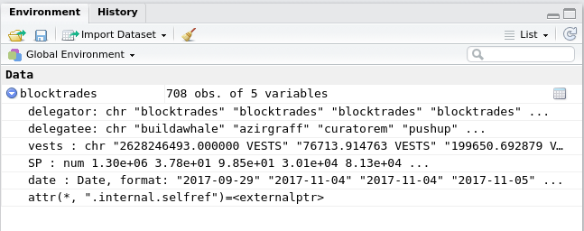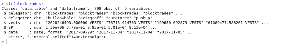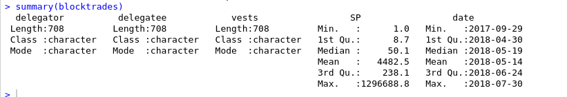 Before modifying of fixing any of our data we can use some functionality from R to have a look at it. We will work through some of these tools using live data from the Steem Blockchain.
