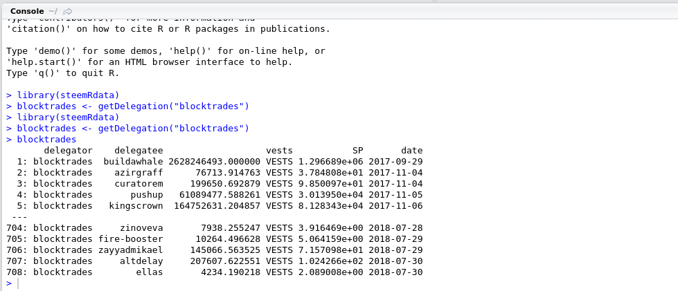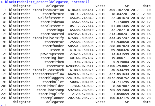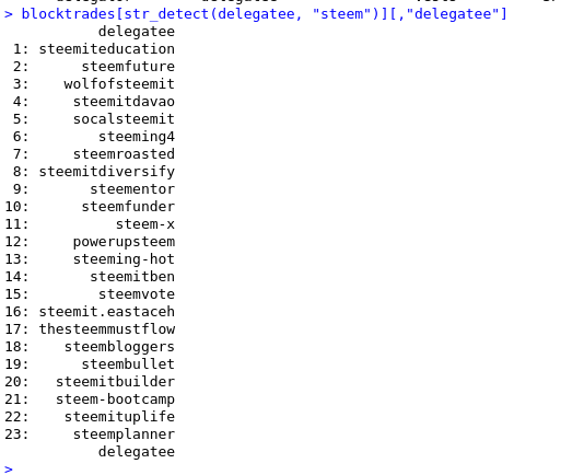 blocktrades[str_detect(delegatee, "steem")][,"delegatee"]