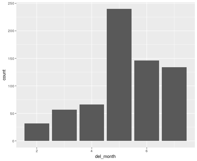 - geom_bar() counts the number of observations in each bucket, in this case the buckets are specified by the month.