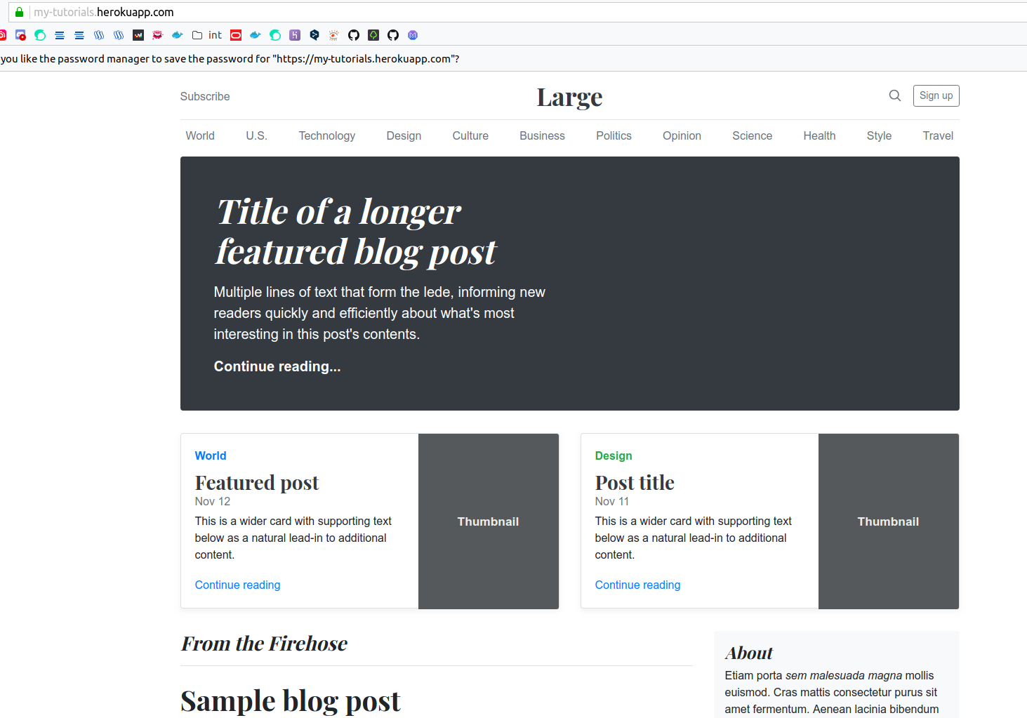 Go to own-app.herokuapp.com (example https://my-tutorials.herokuapp.com (admin/admin)).