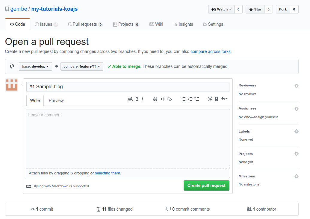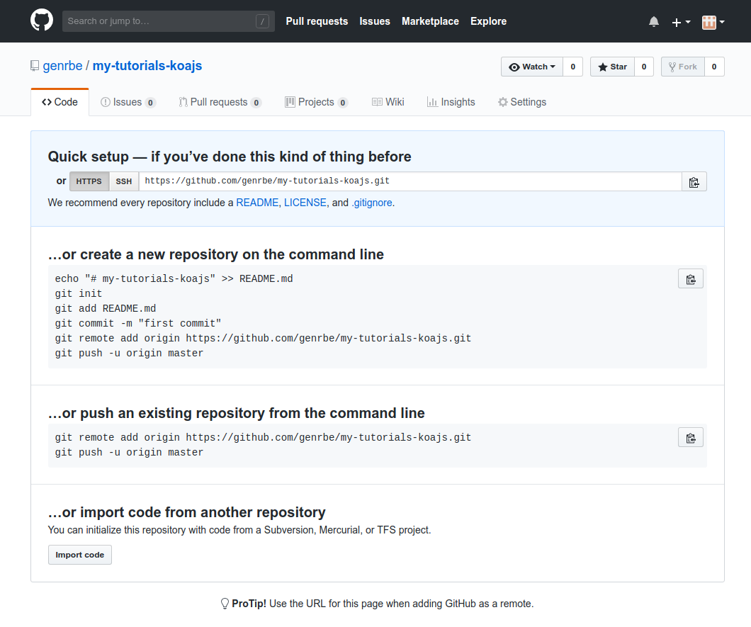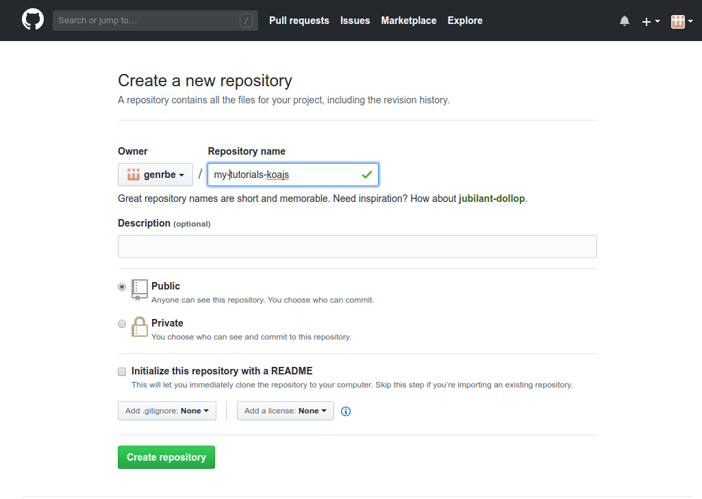 • Set 'Repository name'. For example: ‘my-tutorials-koajs’.