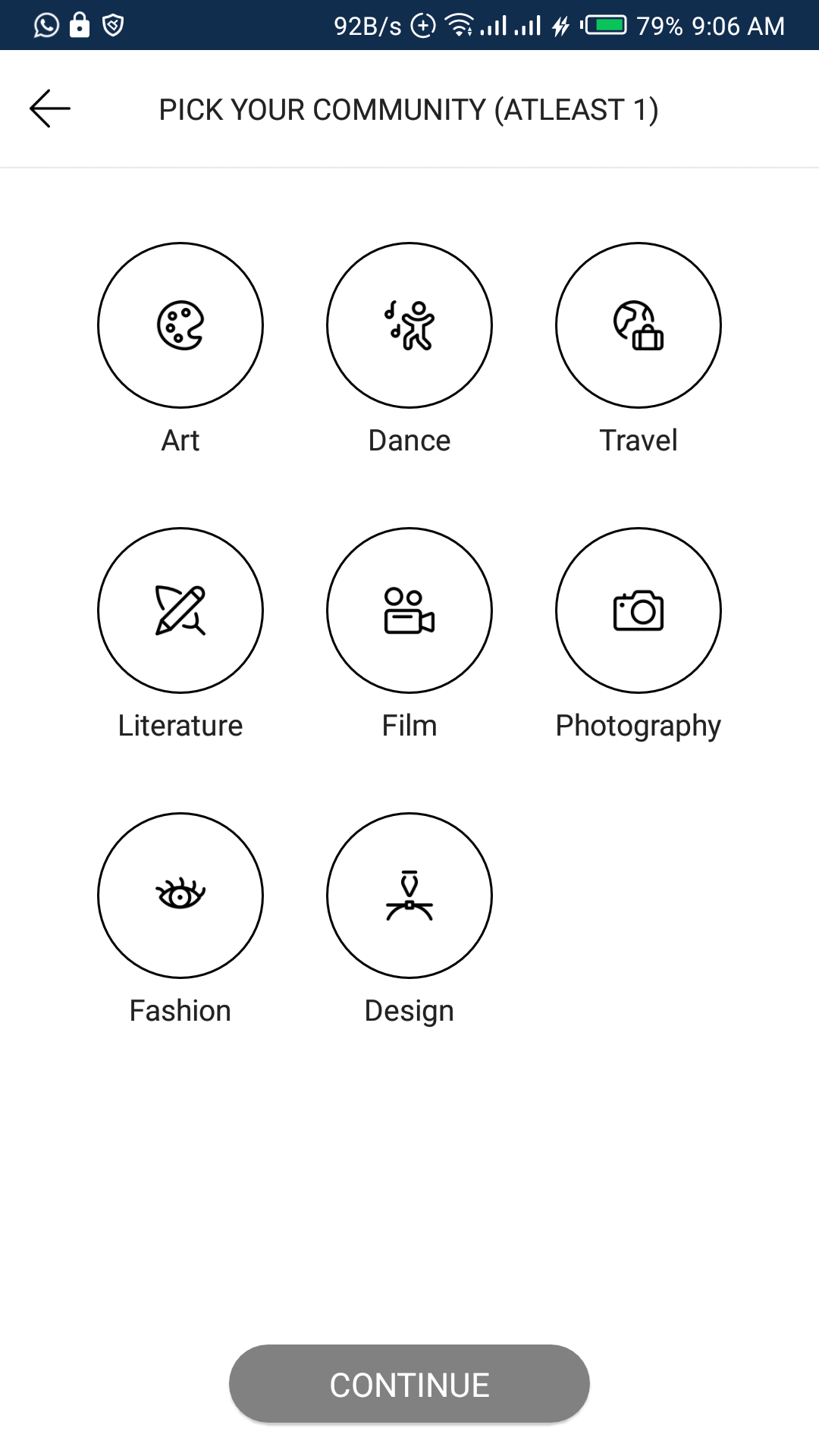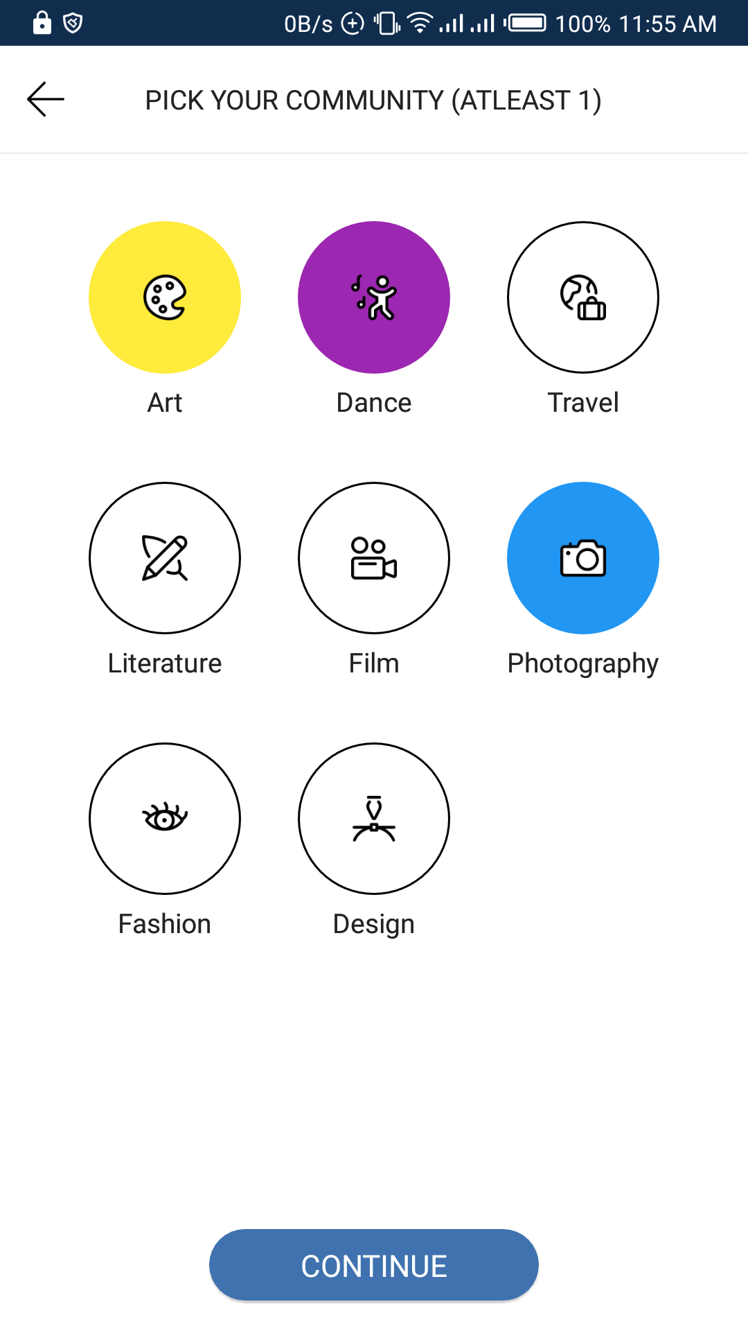 Once you sign into the app using Steemconnect, it shows you 8 communities (Art, Dance, Travel, Literature, Film, Photography, Fashion & Design) which you are to select at least one from.