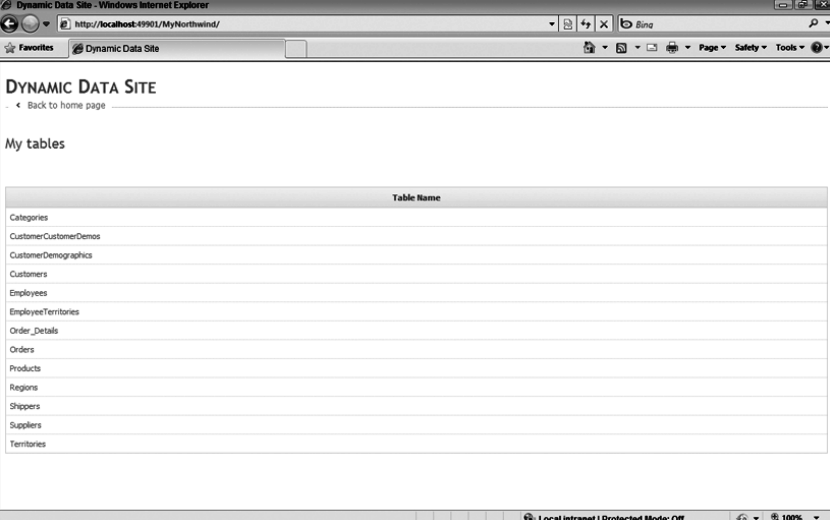 Press the F5 key to compile and run the site, if you have followed correctly all the steps you should see a page appear with the list of tables in your Linq file.