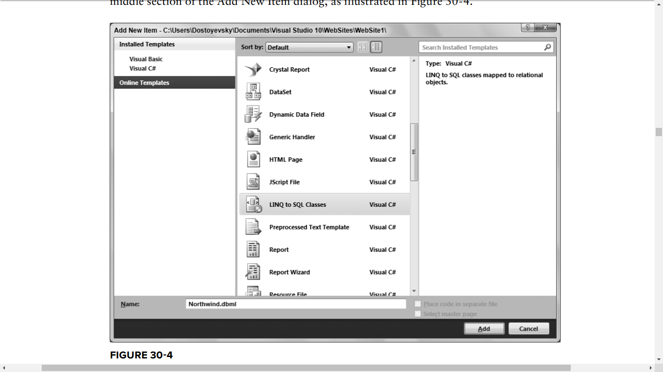 We will add an element of type LINQ to SQL Classes that we will call Northwind.dbml Visual studio advises you to put this object in the App_code directory. Accept and click Yes.