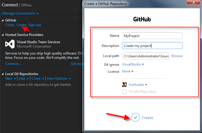 Previously, if you needed to set up a repository, you had to create it on the GitHub home page or use the Git tool. Now that you have GitHub extensions, programmers can create repository directly on Visual Studio。