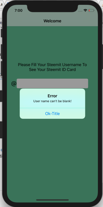 To fix this crash i applied validation check on steemit username field. Now if user writes wrong username or write nothing in the field and try to get id card, app gives prompt to user like this :-