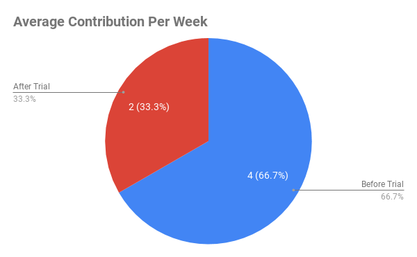 During the trial period, 4 contributions a week was the average. The moderators were also contributing to encourage and set an example for everyone.