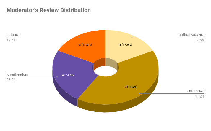 I did not have to review any contribution during this period. But I read every scored contribution and their respective written reviews.