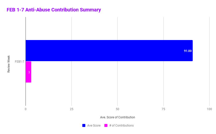 The team reviewed and scored 3 anti-abuse posts this week. It's up by one compared to last week's total contributions.