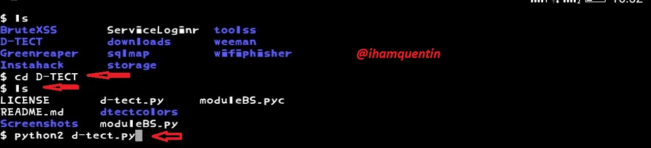 lsand you would be shown the list of existing files on your termux, all you need to do now is open the D-tect directory with the commandcd D-tect && ls(these command opens the D-tect directory and lists its content).