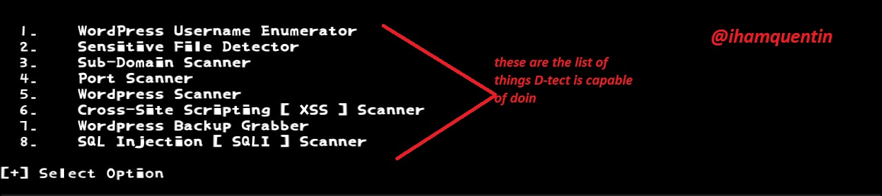 python2 d-tect.pyit helps you access the D-tect program using python2, now your D-tect interface is open, and you would see a list of eight(8) things you can do using d-tect. Make make use of any of these just input your desired number and follow the instruction.