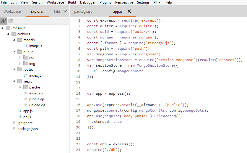 And in the following image we can appreciate our app.js file in full development, there we fata only the part of initializing the server.