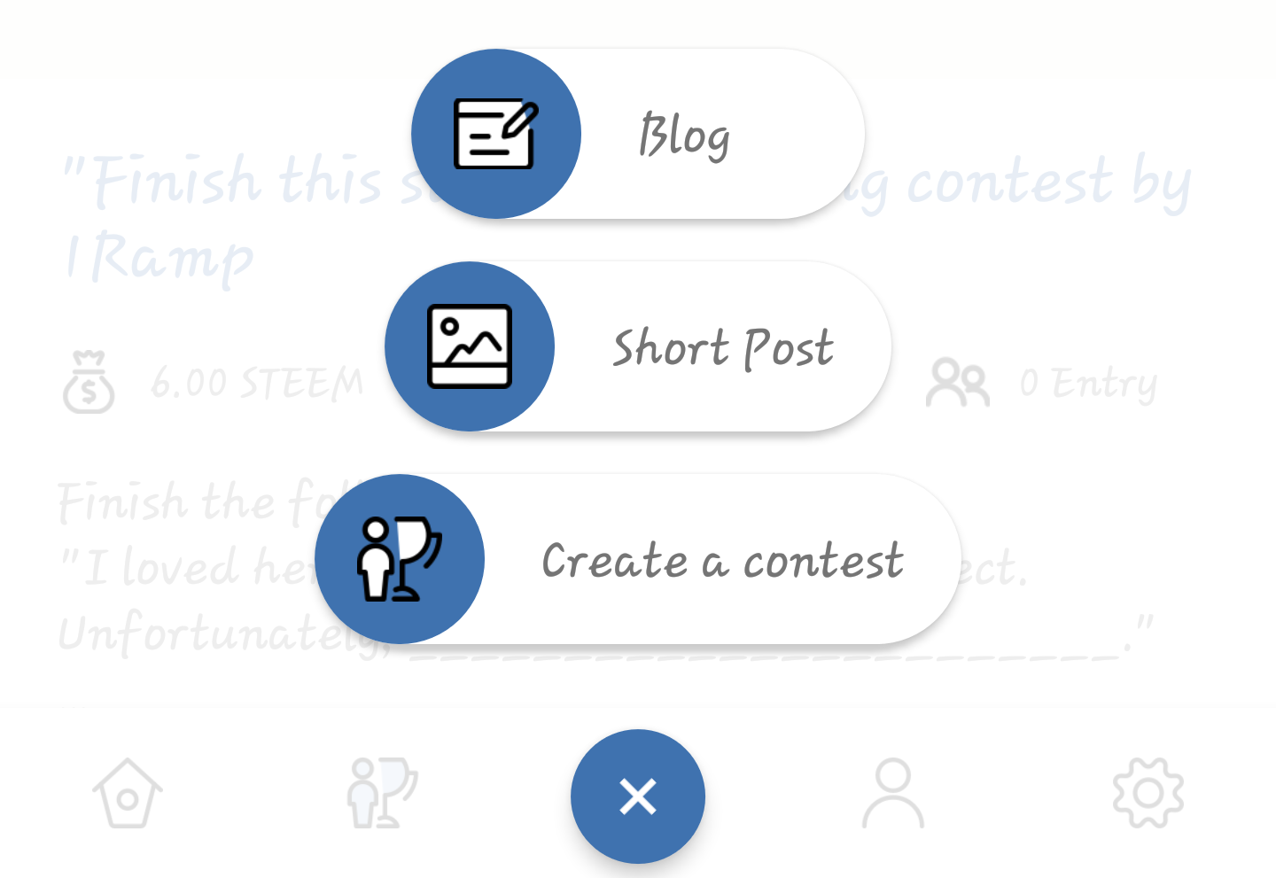 Creating a contest on 1Ramp is just like writing a post. Previously, only accredited users had the ability to create competitions on the app. Now, this feature is opened to all. There are now three options when you want to write a post. The options are blog, short post and create a contest.