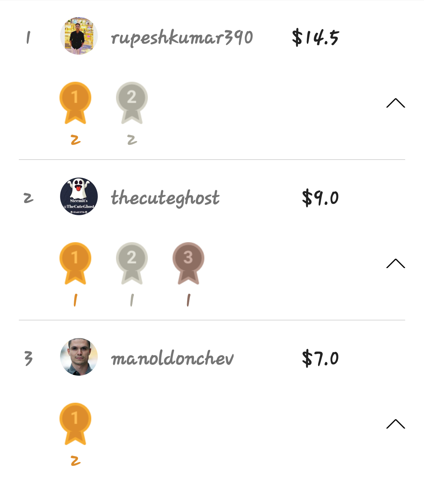 The first person on the list is rupeshkumar390 who has won two contests, with first and second positions. While thecuteghost has won three contests, with first and second and third positions respectively. Lastly, the third on the list, manoldonchev, has won only one contest.