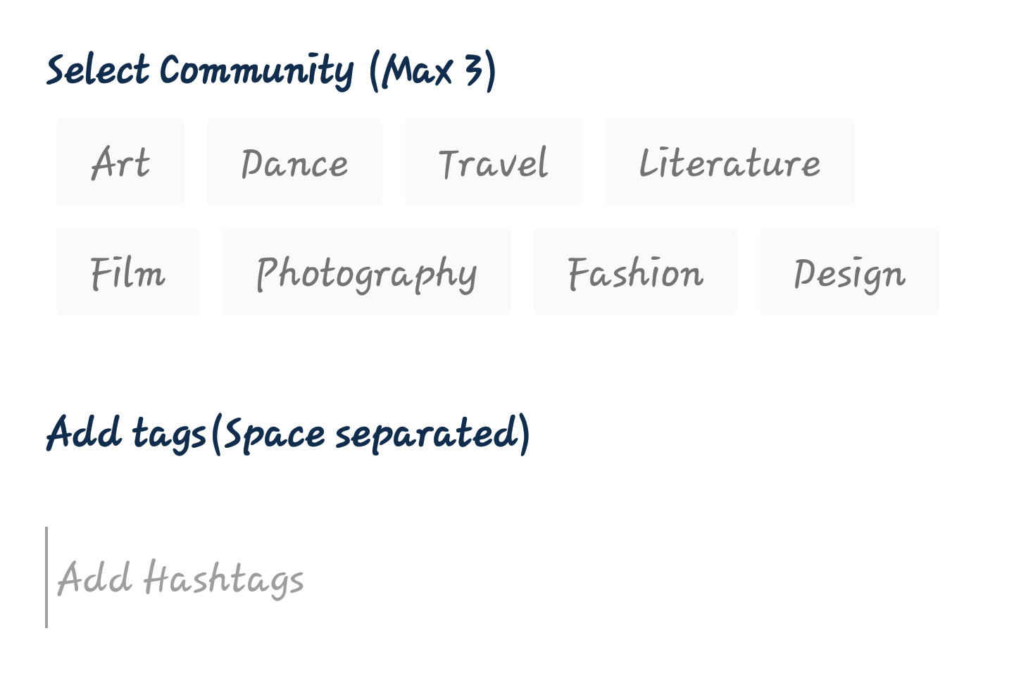1Ramp has 8 communities, and you can only pick 3 in a contest post. For a writing contest that involves explaining what you think goes on in a photographers head, the literature and photography communities can be selected. I might include the film community too. And add related tags to the posts.