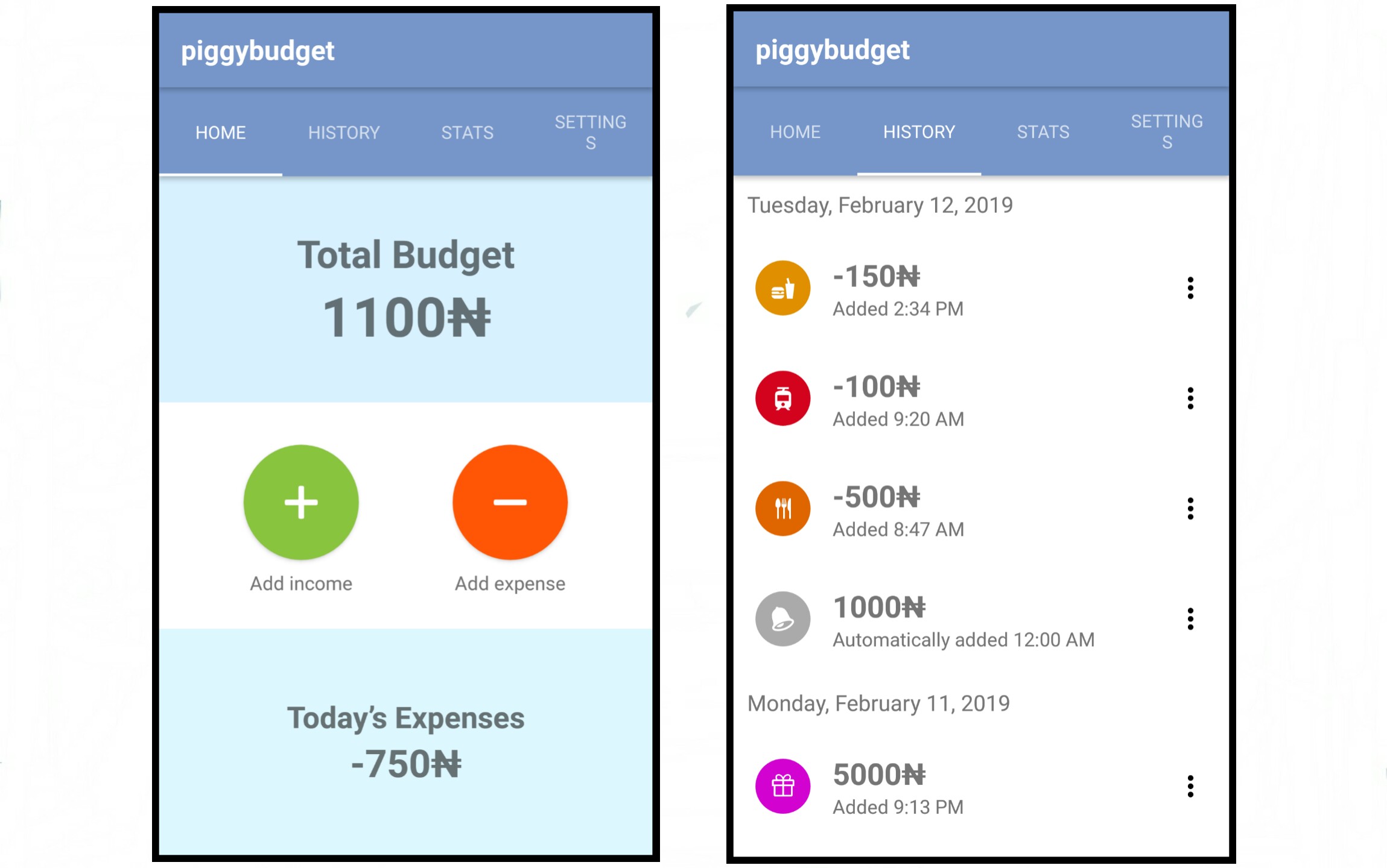 The Stats Page shows the statistics on how your money was spent. There are three different tabs on the Stats Page - the weekly/monthly expenses, the weekly/monthly income and the weekly/monthly/yearly distribution expenses.