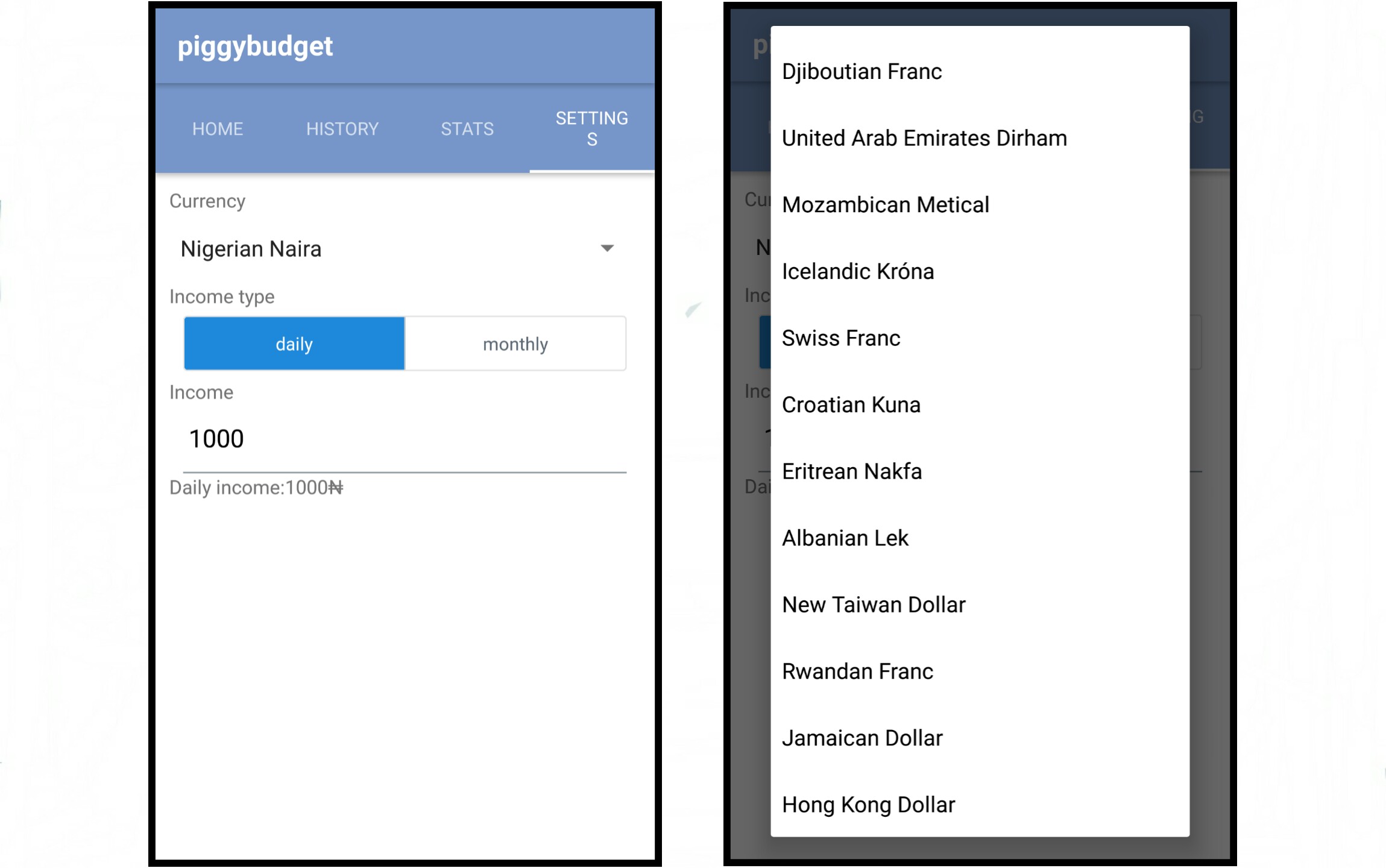 This is the last page on the app. It can be used to change the currency that is shown on the app. By default, Euro is selected as preferred option. You can specify your income in the settings page, while selecting the income type - either daily or monthly amount. If an amount is inputted as monthly income, it automatically calculates the daily equivalent.
