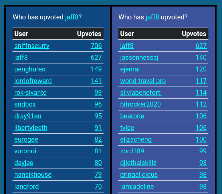 Looking up my account on this tool shows where most of my upvotes are from. Sniffnscurry is number one on "Who has upvoted jaff8?" tab, with 706 upvotes. Jaff8 is number two on this list with 627 upvotes. This means that I upvote most of the articles I post. Well, heaven help those who help themselves. :D Penghuren is number three on the list, with 149 upvotes.