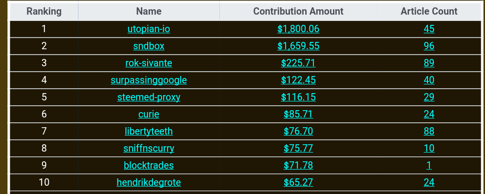 The contribution amount shows the worth of all the upvotes received from these accounts. The contribution amount is displayed in dollars. You can get how the website arrived at the contribution amount through the article count column. Utopian's $1,800.06 contribution from 45 articles, signifies the sum of their upvote values from the 45 articles: $1,800.06.