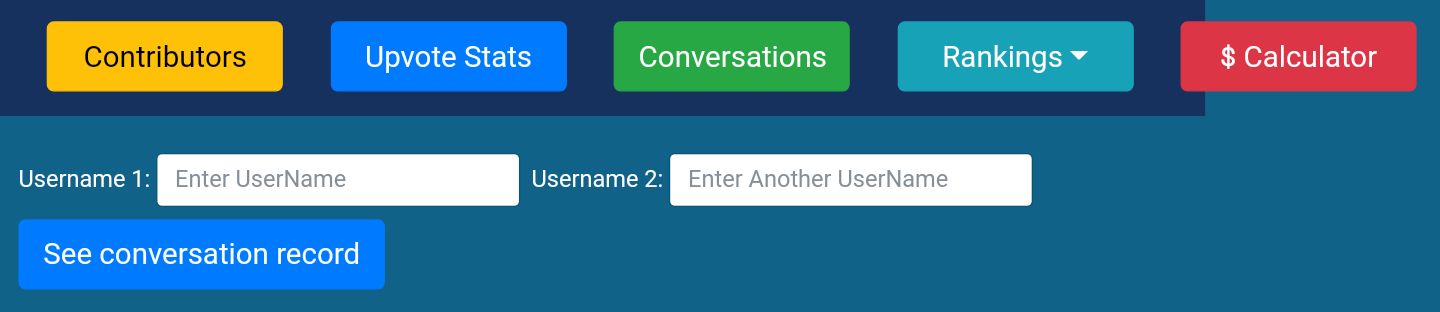 This tool's page is divided into two. It shows who have upvoted a user and the number of post that was upvoted. This is quite different from the Contributors' tab. The Contributors' tab is focused on the worth of upvotes, while the Upvote Stats tab is focused on the number of upvotes.