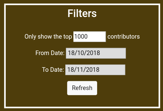 There are filters on the Contributors' page. You can chose the number of top contributors to display. If I want to see my top 5 contributors, I'll input 5 in the box that shows 1000 in the screenshot above. I can also check top contributors within a defined time period. Let's say I want to check for top contributors for the month of October. I'll set the date from 10/01/2018 to 10/31/2018. That would show me top contributors for the month of October 2018.