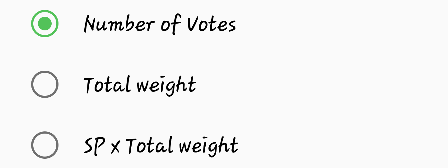 There are three ranking types on this page. You can decide to show the Upvote Stats by number of upvotes, by total weight or by SP and total weight. Selecting the number of upvotes ranking is self explanatory. When you select the total weight ranking type, it shows Upvote Stats based on the voting weight used. While selecting SP and total weight ranking type shows a list based on the voting weight used in relation to the account's steem power.