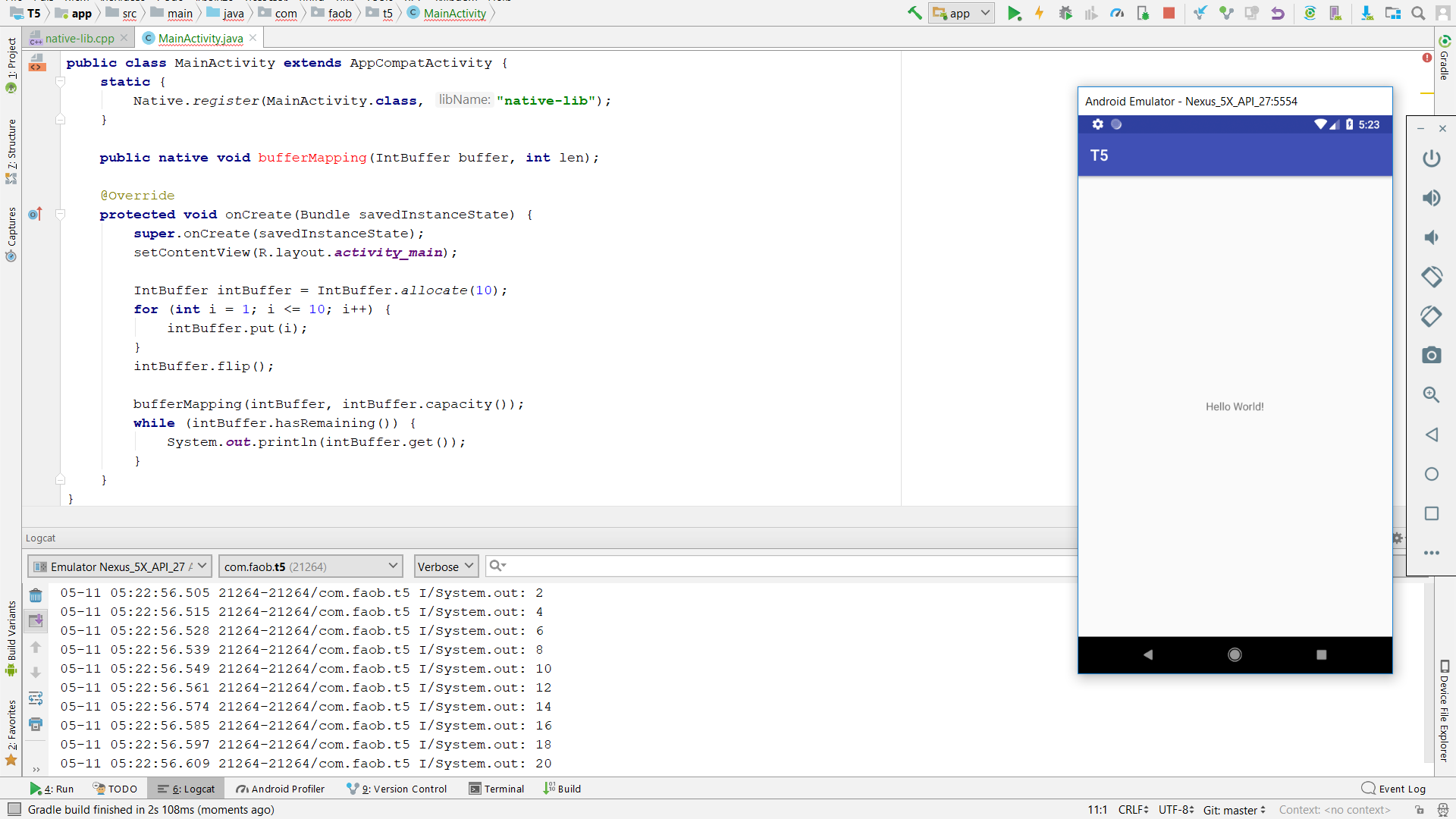 In static block of a class we load our shared library, first argument to Native.register() method is the class in which we defined our native methods and 2nd argument is the name of native shared library. Name of shared library is native-lib we can change this default name in CMakeLists.txt file which is available in app folder. Loading should be done in static block which will load shared library during class loading time.