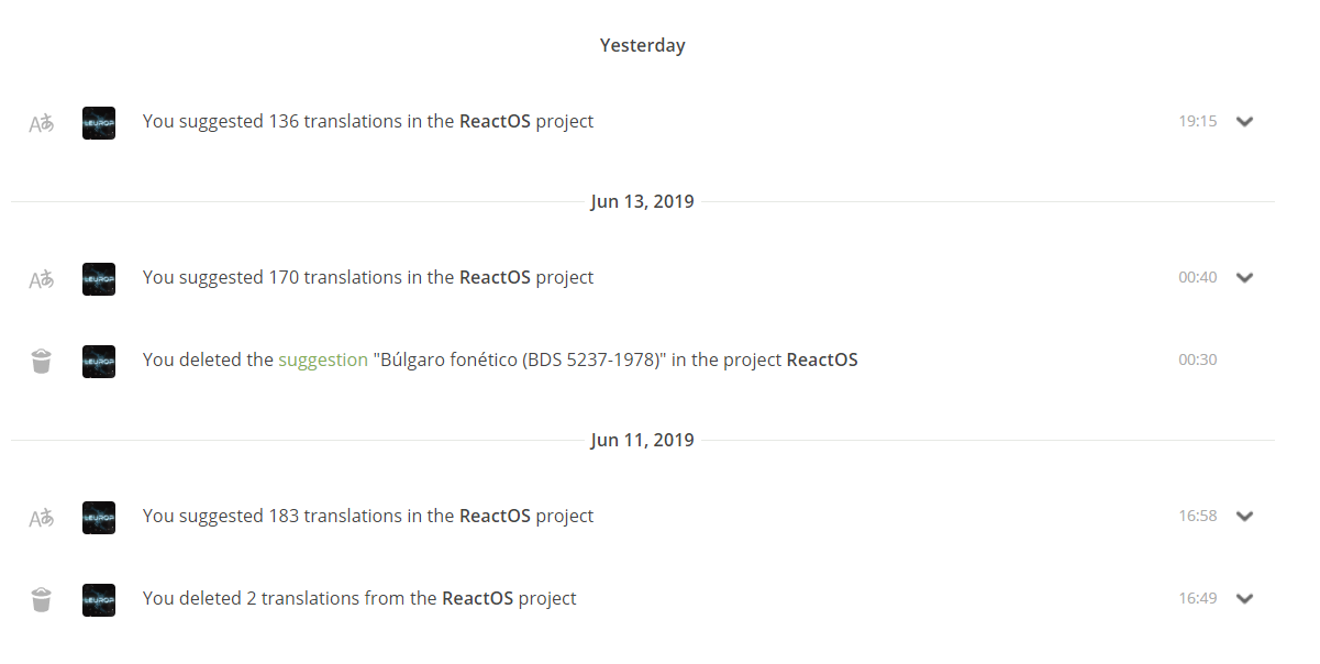 The record of my translations are on my crowdin profile and can be found here aswell as my activity.