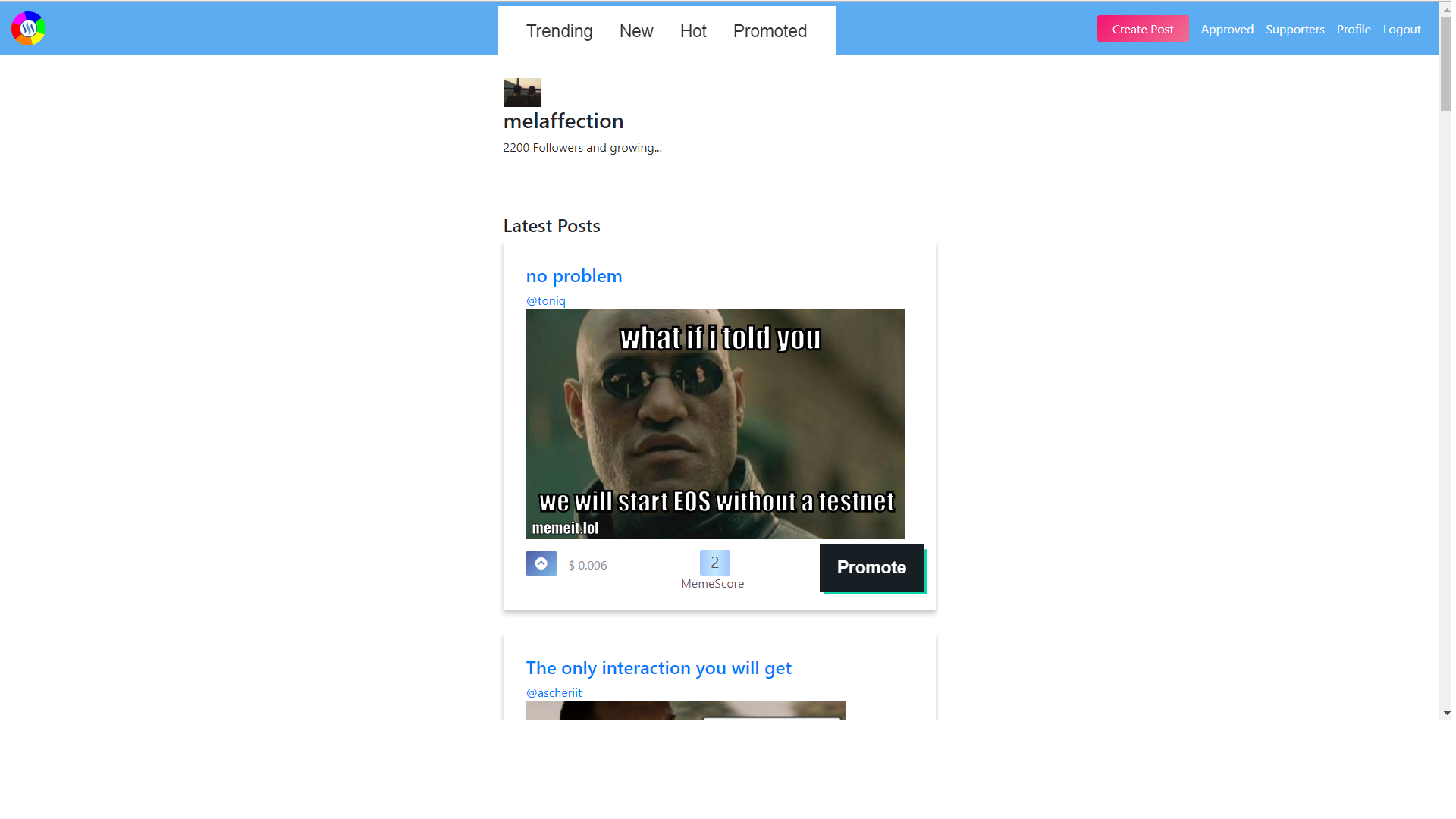 • Trending,new,hot and promoted feature : When a user post a meme,the meme will drop in to the "new" section.If the user wants to promote and reach more users they will pay sbd or steem to memeit and the meme will be on "promoted" section just like it is in Steem.If the post gets popular it will be also in "trending" and "hot" sections.