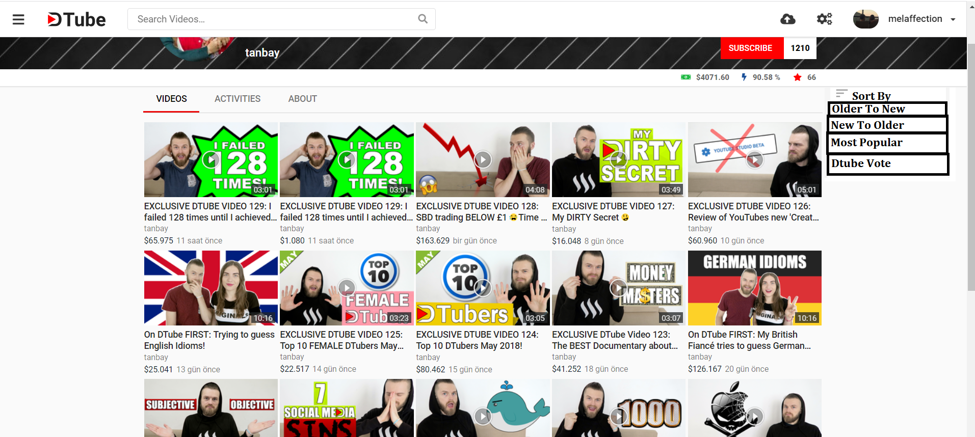 When a user goes to his/her favourite dtube member and if the member has for example 1000 videos which is possible in vloggers,they can't find any video they want from the current style.With adding "sort by " feature users will be able to choose the older,newer,most popular and "Dtube voted " ones ;