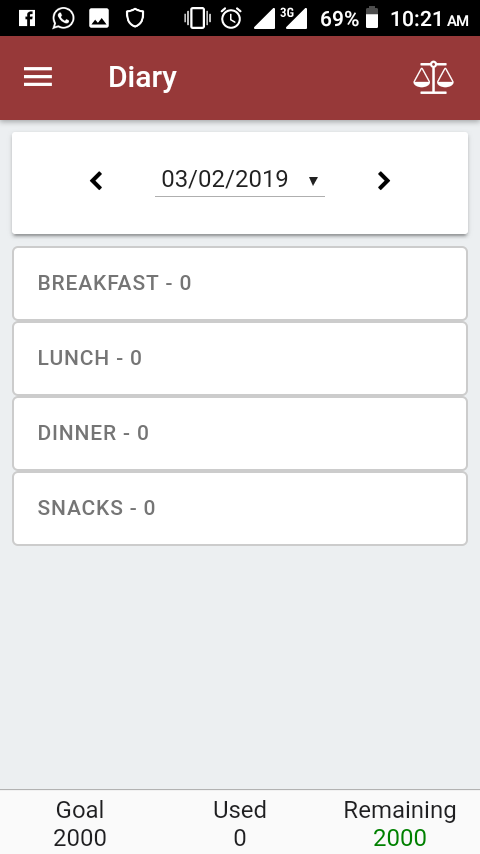 Coming down to your nutritional guidance, Waistline can render you their quality service. During those time while I was battling with my waistline reduction with this app, I created a diary where I can log in my daily calories intake and track down the fat burn. The menu in the diary took me to the portion where I can select the food items that I can add to the list in the diary. The date will also display at the bottom of the screen as shown below.