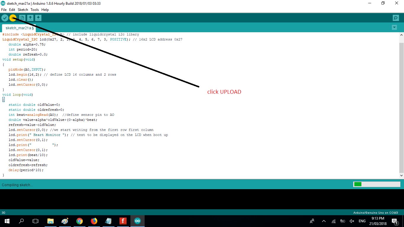 In the code we have used analog read function to read output of Heart Beat sensor module which is connected to a0 of the arduino, when making a code we need include all the libraries we will be using we have to add the library that we have recently downloaded. #include <LiquidCrystal_I2C.h> for the i2c 2x16 LCD DISPLAY. and the #include <Wire.h> which is already in the IDE.The address LiquidCrystal_I2C lcd(0x27, 2, 1, 0, 4, 5, 6, 7, 3, POSITIVE); is the i2c address woth only 4 pins, if your using the 16 pin then you need to use different address here.setup() method is ran once at the just after the Arduino is powered up and the loop() method is ran continuously afterwards.