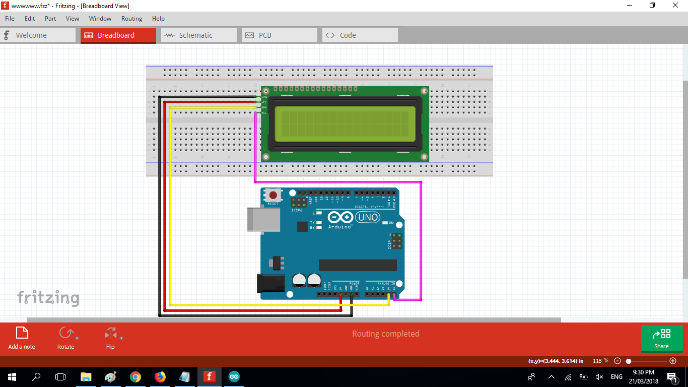 The connection of 16x2 LCD with i2c breakout to ArduinoLCD has 4 pins (1) VCC it refers to the power signal of the LCD typically connected to 5volts, (2)GND or sometimes zero voltage, It is also the common connection of the LCD must connect to in one way or another path in order to complete the circuit. the SDA and SCL refers to the 16 normal pins of the LCD which connected to analog pin outputs of the arduino