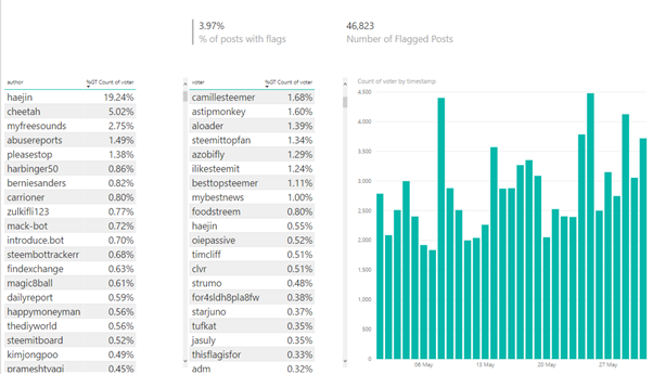 In votes above we also have flags, however combined only 0.82% of posts had a net downvote status. Below is some further information on flags. 46.8K posts received 1 or more flags( this is posts not comments). This makes up 3.97% of all posts made. In the first table we can see the authors with the highest % of flags and after this we can see the time series for when flags were given.