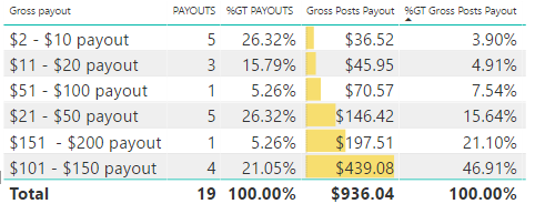 The % of posts with a pay-out of <$1 is down to 63.99% from 63.62% in March. The number of posts that earned over $500 reduced from 86 in April to 66 in May.