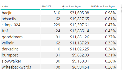 From this report we can see that many of the top earns from last month are still on the list. @burnpost is still in the top list, showing a little karma!