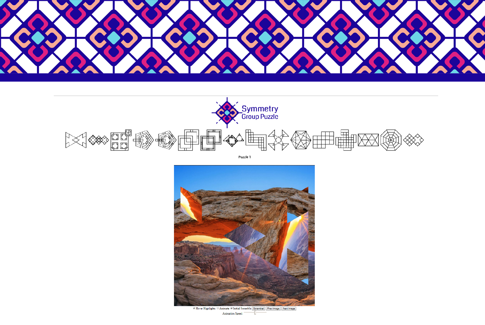 SymmetryGroupPuzzle is a 2-dimensional twisty-puzzle game that runs in your browser. You can see it at the following link. https://sym-grp-puz.herokuapp.com/ This game features a kind of twisty puzzle based upon the symmetries of overlapping shapes. Every shape of the plane has an associated group of symmetries (even if it's just the trivial group!) A symmetry of a shape is simply any way you can remove it from the plane (leaving a hole in its place), re-orient the shape in your hand, and then fit the shape back into the hole. If we overlap a bunch of shapes in the plane, then we can get a larger group of transformations constructed from the individual symmetry groups of each shape.