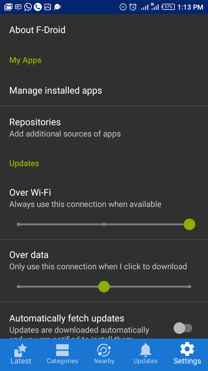 The first time I downloaded F-droid, my first instinct was to check the App's settings to put some things in the right order. I changed my Auto update settings to over Wi-Fi connections only, to effectively manage my data bundle. I make manual updates to specific Apps as I discussed in the update section of F-droid. A massive list of tweaks is available in this section, to help meet individual specific needs. My advice to new users of F-droid, please check the App's settings and make the necessary adjustment to suit your needs.