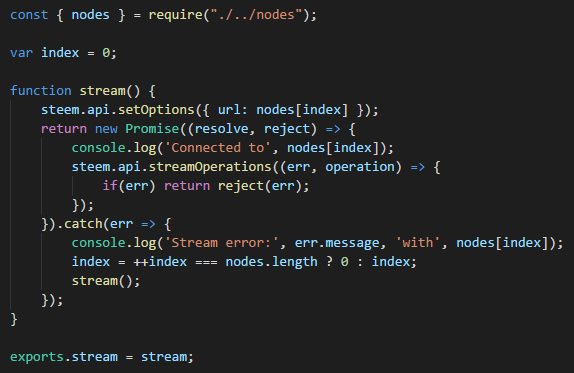 First, out of the function, we get the nodes array from the nodes.json file I already talked about and we declare an index variable with an assigned value of 0. When the stream function is called, we set the RPC node url to the value of the nodes array at the current index. Then we return a new promise that doesn't actually have a way of being resolved but that can reject errors. Some may say that it's bad practice but I strongly disagree, promises that don't resolve anything can be really useful, you just need to be cautious when using them and not expect any value to get resolved. In the promise, the steem.api.streamOperations function is called. If any error is encountered while streaming (bad gateway, unable to acquire database lock...), an error is rejected and catched. The error message is then logged as well as the node that caused it. Then, the index gets incremented (and set to 0 if its new value is equal to the nodes array length) and the stream function is called. Since setting the RPC node to be used is done at the beginning of the stream function, it will change node before calling steem.api.streamOperations. This process repeats over and over again until the app execution is ended manually or an unhandled error is thrown (which shouldn't happen). This implementation may not work as expected if you want to stream all the operations that happen since you will probably miss some while switching between nodes, but I'm not sure there is a way to prevent that with any node switcher implementation anyway and switching nodes is really fast so you would have to be extremely unlucky for that to happen.