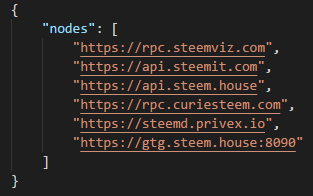 The node switcher needed a JSON file to store a list of available nodes. Previously only the 'rpc.steemviz.com' node was used, now the six following nodes can be used by the app. This was definitely needed because you can't trust a RPC node to be working 24/7, no matter how reputable it is. If you are looking to fork DiscoSteem-Bot and change the nodes to some you prefer, make sure that those nodes aren't low memory ones or the app won't work. Low memory nodes return some properties as empty like the json metadata and the body of posts, that's something I learnt the hard way.