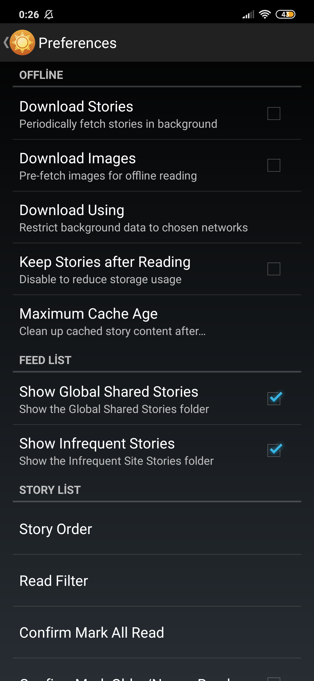 As you can see, there are 5 options in the offline settings tab. If you don't have an internet connection, you can use the NewsBlur app offline with the Download Stories feature. If you want, you can also download images of the feed with the Download Images feature. If you want other stories to be downloaded automatically while you're reading a story, you can use the Download Using feature. This is a really great feature! I have been using this RSS feed reader for a long time because of this feature. While I read my favorite stories (with the internet connection), the stories I haven't yet read are downloading automatically. With this feature I can easily access stories when I don't have an internet connection.